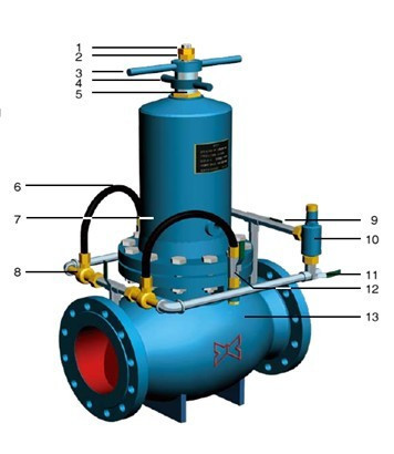 如右圖所示,ZJY46H活塞式減壓閥是由主閥和反饋系統組成。圖中所示為功能代號④的產品:雙反饋。可反沖排污、內鎖定保護型。