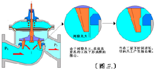 4.2.2導向爪與閥座的間隙太大(總間隙1mm)。因此,當紊流產(chǎn)生時形成導向爪與閥座之間的相互撞擊。由于導向爪為銅材質(zhì)、閥座為不銹鋼材質(zhì),工作時間一長,在導向爪上形成撞擊痕跡。如圖三所示