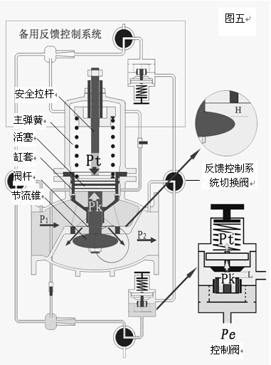 當P1上升時,減壓閥的P2+ΔP2首先表現(xiàn)為上升,其值通過反饋系統(tǒng)出口管傳到控制閥,使Pt′+ΔPt′,ΔPt′與Pk′的力達到新的平衡,控制閥h減小;相應ΔPk′壓力增大,經(jīng)壓力導管,使主閥的Pk+ΔPk,Pt=Pk+ΔPk壓力達到新的平衡,主閥h減小、ΔP2值恢復為原P2值。當進口壓力P1下降時,主閥與控制閥的工況則與上述的工況相反。